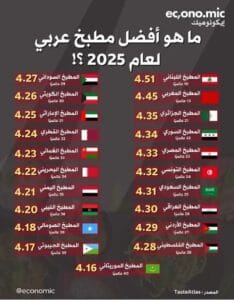 جاء المطبخ اللبناني في المرتبة الأولى عربيًا بتقييم 4.51، ما يعكس شعبية الأطباق اللبنانية عالميًا بفضل التنوع الكبير في المأكولات والمزج المتوازن بين النكهات الشرقية والغربية وتلاه المطبخ المغربي بتقييم 4.45 الذي حافظ على مكانته بفضل وصفاته التقليدية التي تعتمد على التوابل الغنية والأسلوب الفريد في الطهي.