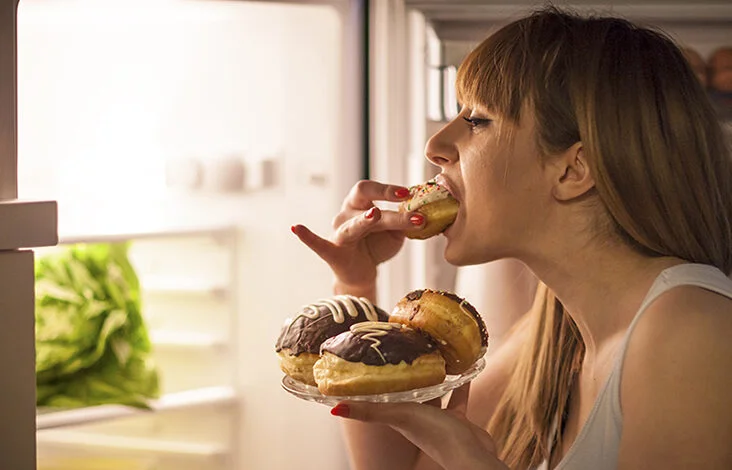 كذلك الأكل في الليل المتأخر، والبحث في الثلاجة عن شيء لتناوله بعد العشاء، خصوصاً عندما نستيقظ من النوم بشكل مفاجئ، أو عند السهر ليلا.