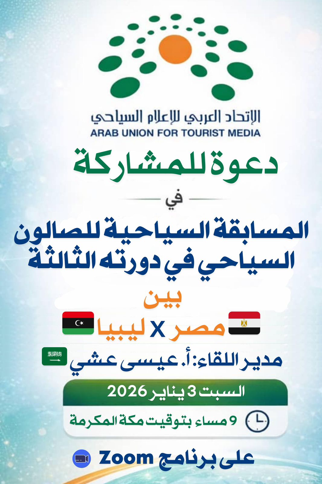 أعلن الاتحاد العربي للإعلام السياحي متمثلاً في مجلسه التنفيذي عن تنظيم فعالية مرتقبة، حيث تتجه الأنظار مساء اليوم السبت 3 يناير لعام 2026 نحو الحدث، الذي يجمع بين فريقي مصر وليبيا في إطار منافسات بطولة الإعلام السياحي بنسختها الثالثة.